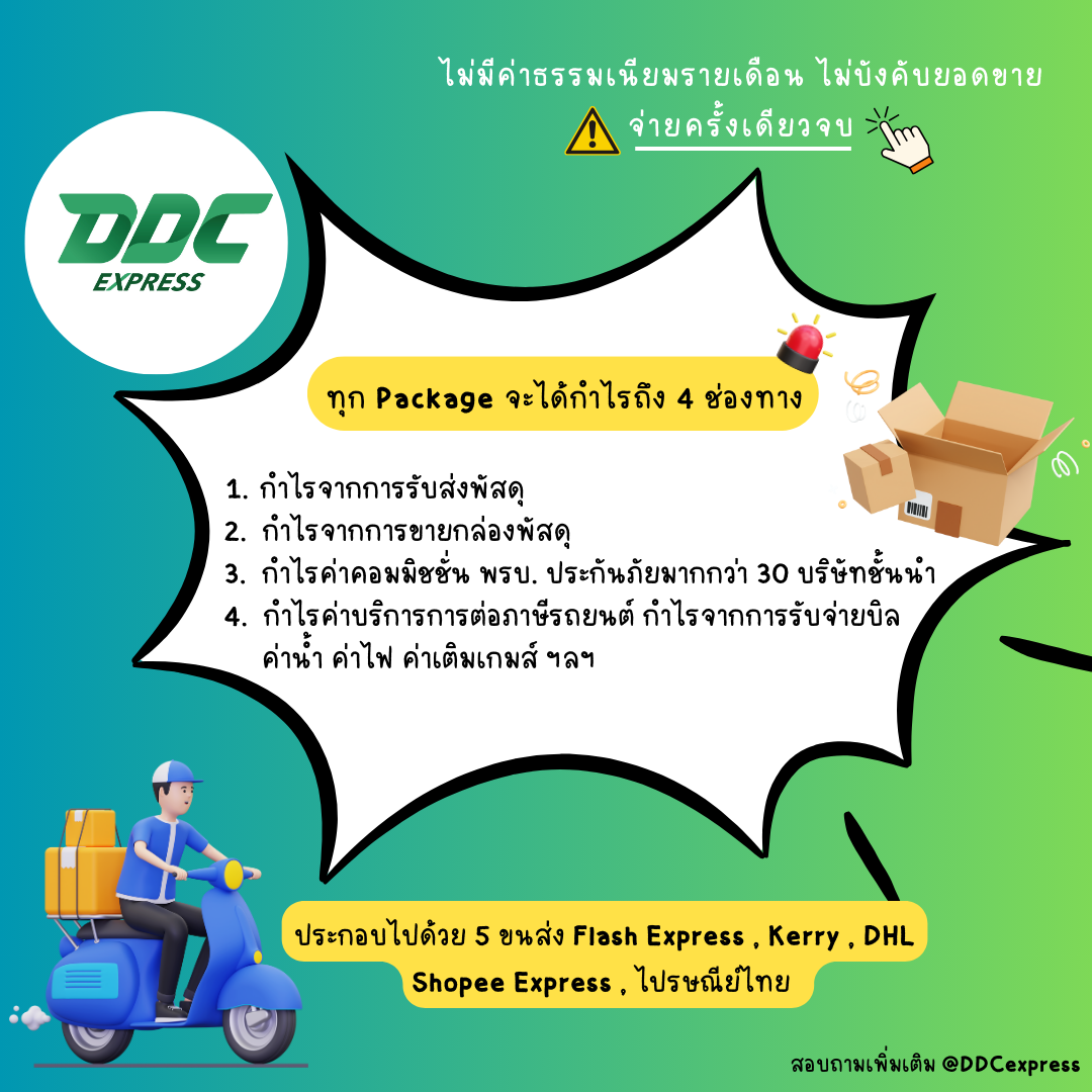 ไม่ว่าจะบ้าน ร้านค้า ร้านเสริมสวย ฯลฯ แค่มีพื้นที่ก็สามารถเปิดแฟรนไชส์รับส่งพัสดุได้ ไม่ได้มีแค่ขนส่งพัสดุ เพราะเรามีจ่ายบิลค่าน้ำค่าไฟ เติมเกมส์ ต่อพรบ. ภาษี ต่างๆให้อีกมากมายครบจบในร้านเดียว คุ้มสุดๆ มีให้เลือกถึง 5 แพ็คเกจ และมีถึง 5 ขนส่งให้บริการ Flash DHL SPX Kerry ไปรษณีย์ไทย